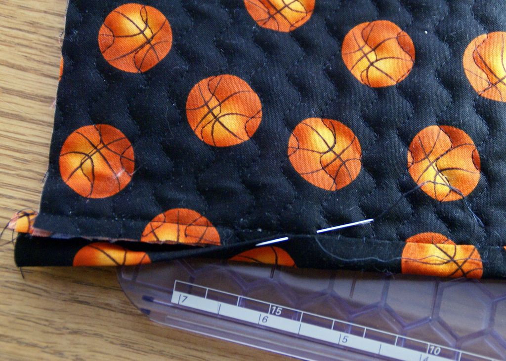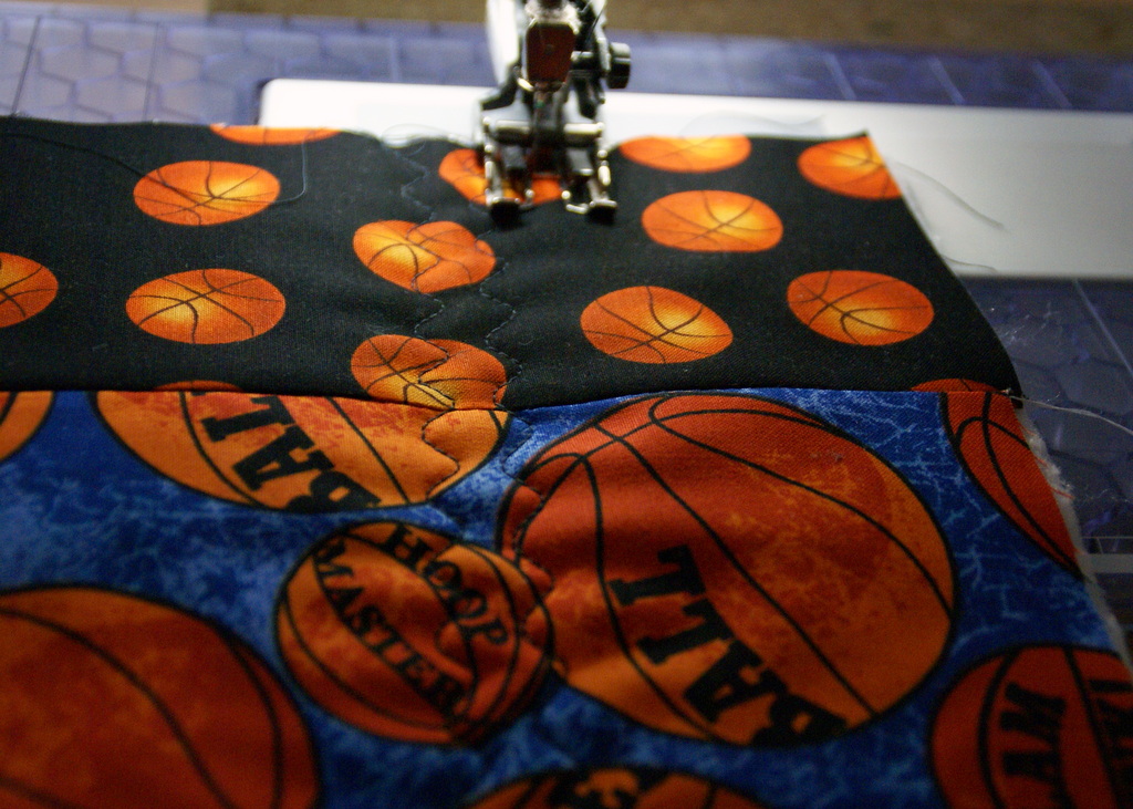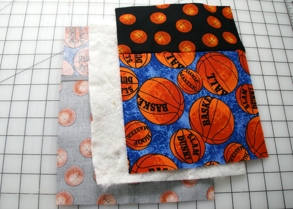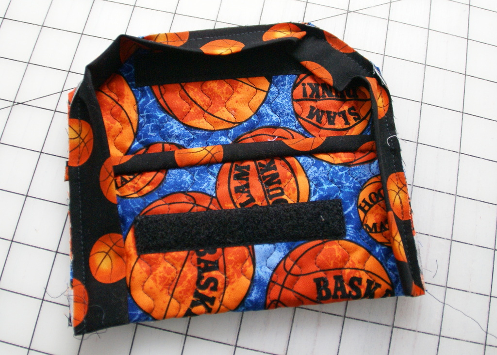 March Madness is over and the Championship game should be finishing up.  With all of that basketball talk, I pulled out some appropriate fabric from my stash to make this sporty cell phone case.  My son wanted an easy, protective pouch to throw his cell phone into and stash in his golf bag while he was at golf practice after school.  This clever, quilted pouch features a handy velcro opening and it is teenager approved to boot.  You could easily mix and match the sporty fabrics of your choice or just choose some solid school colors.  I even made one for myself to protect my phone in my tennis bag.