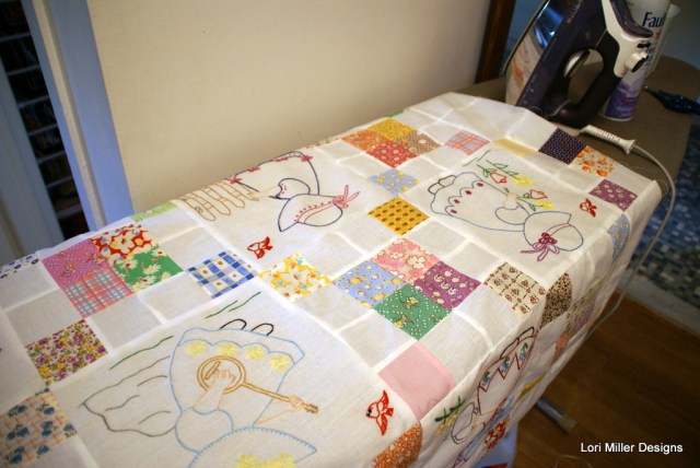 The random squares of 30’s fabrics just seem to have the right combinations to match up with the embroidery colors on the squares.