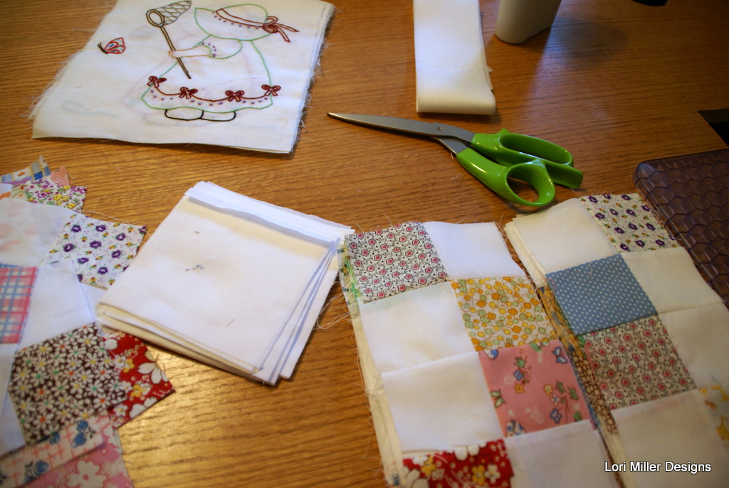 The random squares of 30’s fabrics just seem to have the right combinations to match up with the embroidery colors on the squares.