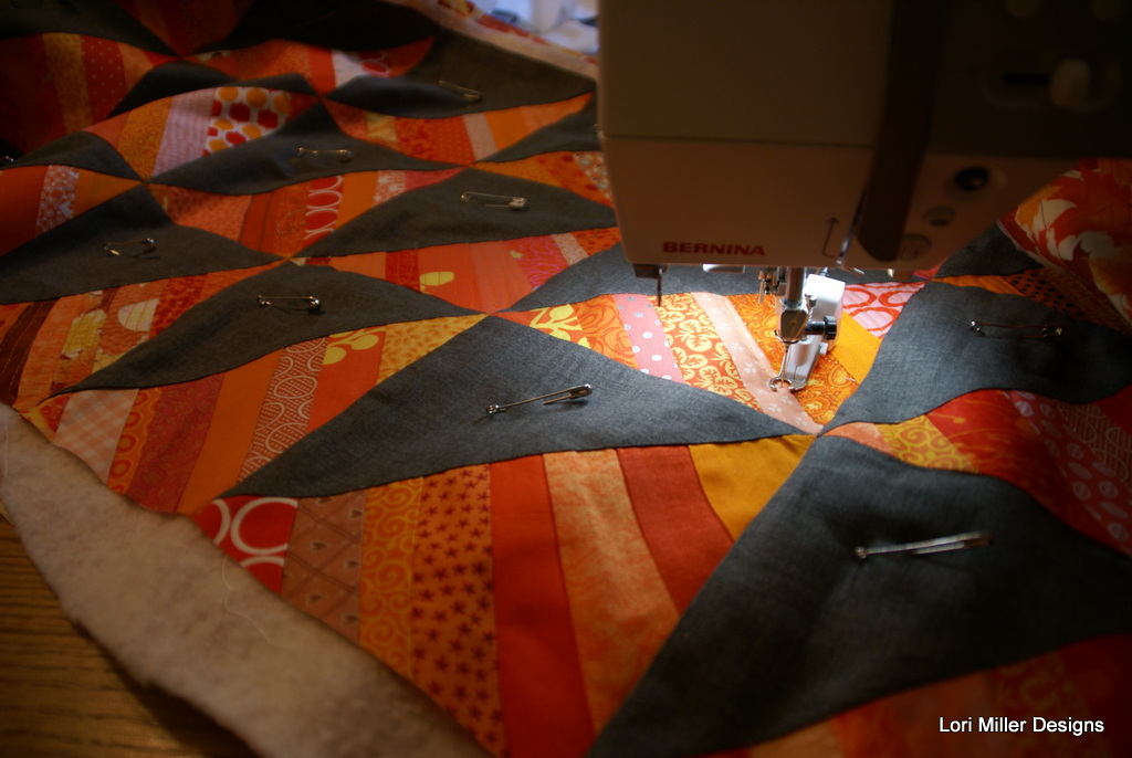 Using my trusty Bernina 630, I put on my BSR foot and started free motion quilting lines through the orange strips keeping them parallel to the seams and kind of even. You don’t have to be perfect with this stitch and it still looks good.