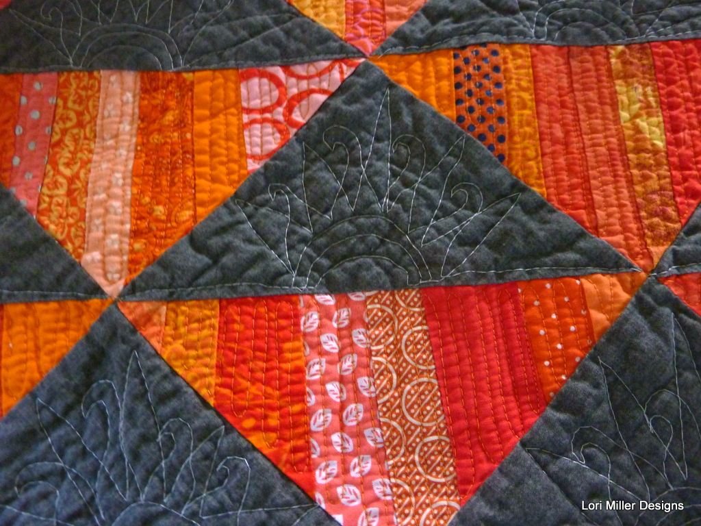 Here is the sun pattern up close. It is perfect to go with the orange rays in the strip piecing. I also liked that it was a continuous design, I just quilted from triangle to triangle in a row without stopping. Everyone is just a bit different, I did not even mark or plan too much, just quilted. I really like it.
