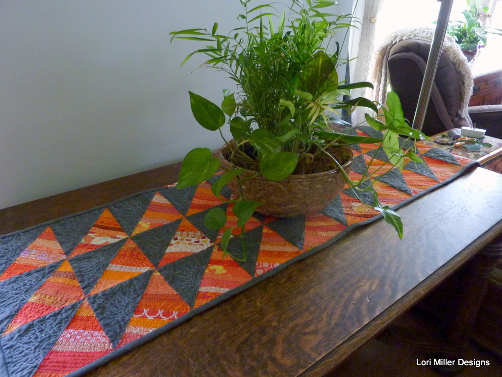 Here is my finished runner, all quilted, washed and crinkly with texture. I think it makes my library table look fabulous too. I used a bunch of orange scraps but why does the box seem just as full when I was done as when I started?? HA HA Happy scrap quilting!