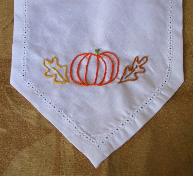 - Using three strands of embroidery floss, embroider the pumkin and leaves with a stem stitch.