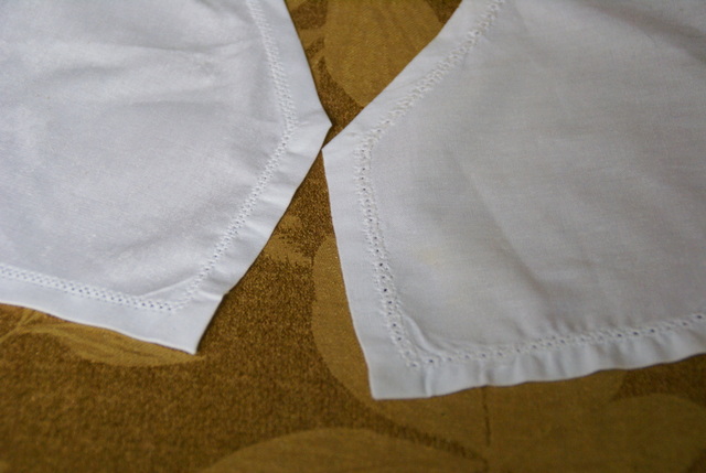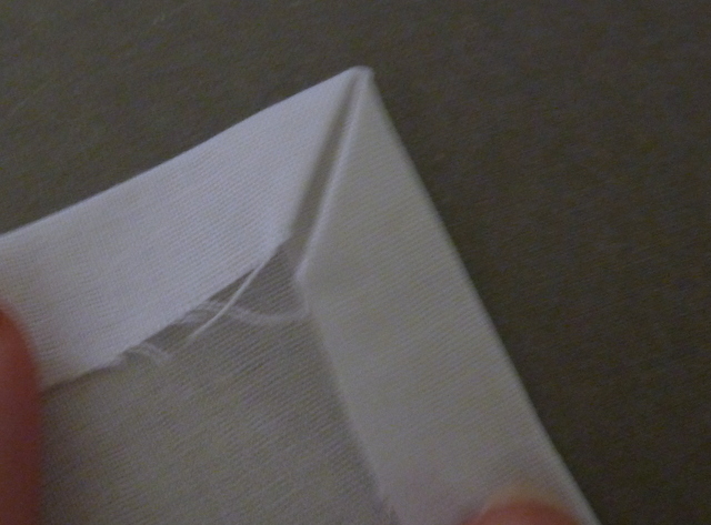 - After you have ironed,I like to hand sew the inner corners so that there are no raw edges. The rest of the sides get caught by the fancy heirloom stitching. Just fold each edge under and take some tiny whip stitches to hold them down. At the point in the corner, I just make about 3 or 4 satin stitches and it looks just fine.