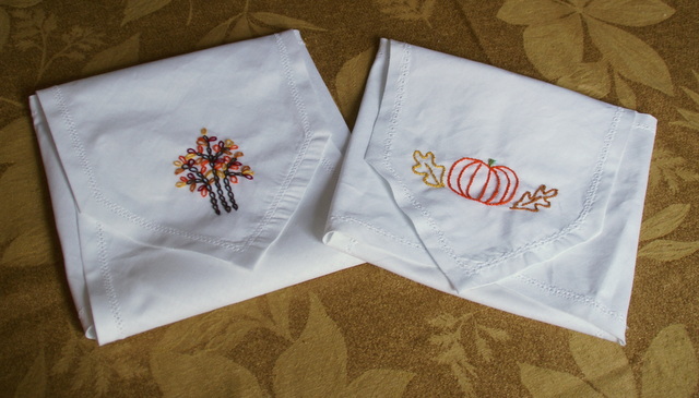 It is not Thanksgiving at my house without some fresh homemade rolls. If my son does not eat them all, they are pretty tasty for little turkey-cranberry sandwiches. I have a very pretty bread cloth that my mother in law gave me many years ago. It makes me think of her when I use it and we lost her last year. Everyone needs a little bread cloth to make Thanksgiving special and perhaps it will become an family tradition. Here is how to make an heirloom Thanksgiving bread cloth for your hot, buttered rolls (homemade or not!). Use the fancy stitches on your sewing machine to sew the heirloom inspired hem. Then embroider one of my designs in fall colors for to match your Thanksgiving decor. This would be a great gift too!