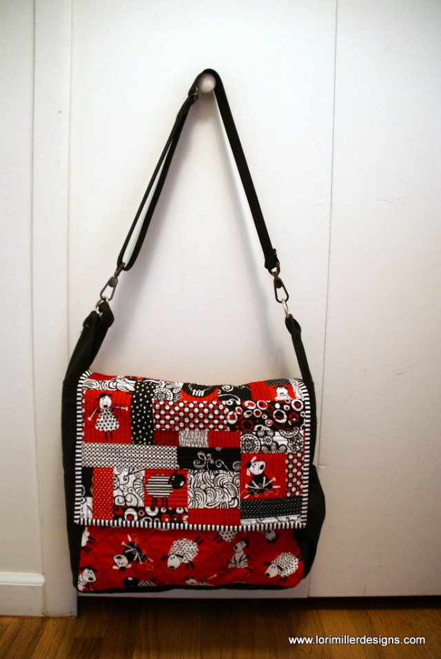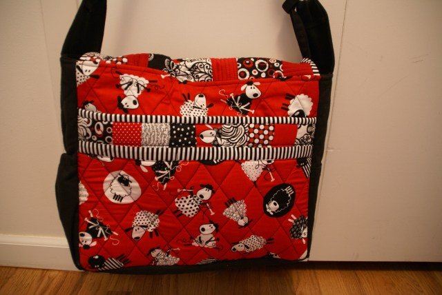 I added a wide adjustable strap. She really liked it and has used it several times. I love the zip that the striped binding gives to the front flap. The solid sides add a calming factor to the busy sheep print, but it is still just too cute. I think the QAYG flap really makes it look special.