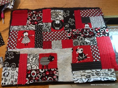 I decided that the front flap was going to be quilt as you go with snippets of the fabrics including the cute little knitting sheep in red, white and black.