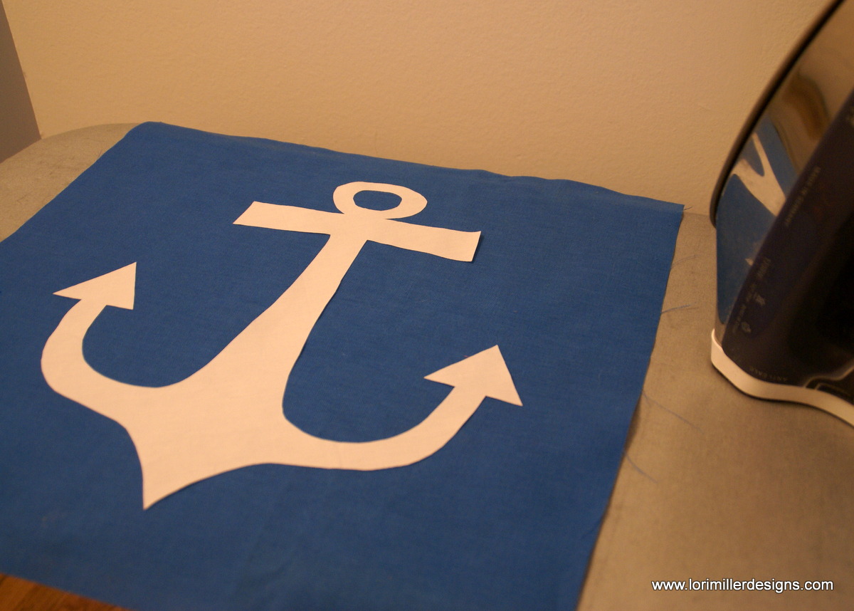 - Next, print out the anchor template and tape it together using the guidelines. Using a light box or a window, trace the anchor outline to one side of the fusible web. Press the fusible web according to the manufacturers instructions to the wrong side of the white fabric 16″ square. Carefully cut out your anchor applique. Peel off any backing.