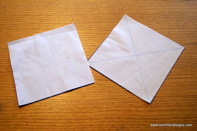 - Place the white square right sides together with the navy blue 6″ squares. Stitch 1/4″ away from each side of the diagonal marked lines.