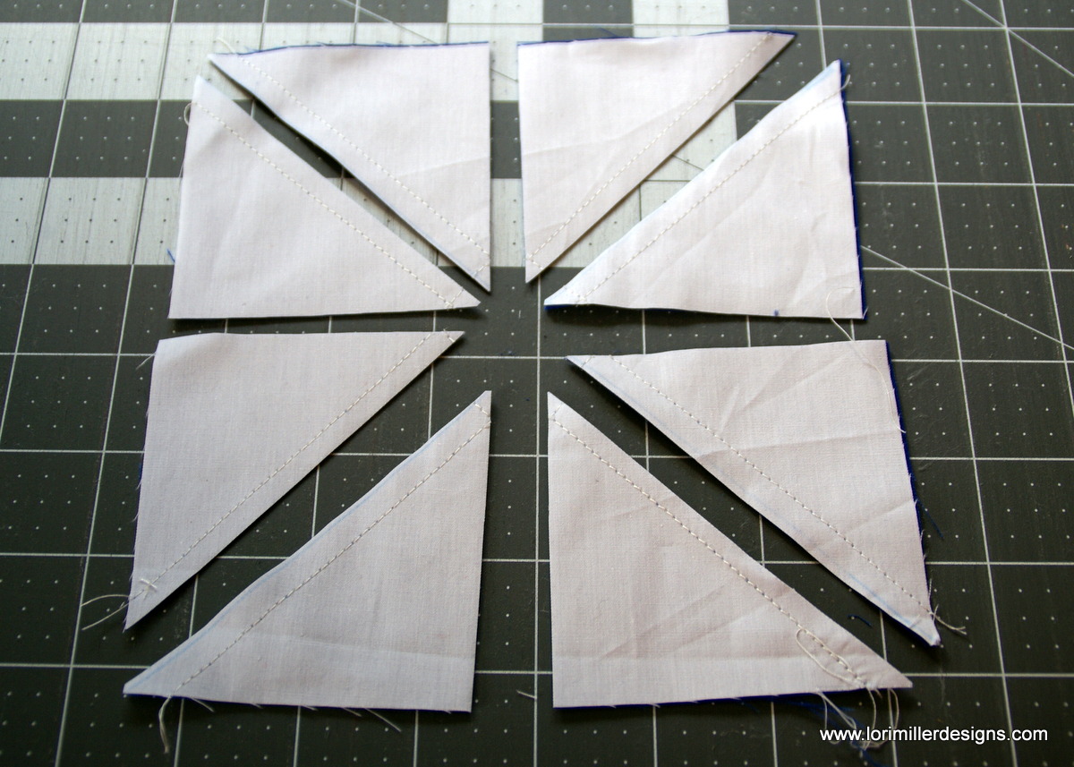 - Carefully cut the squares on the diagonal lines and then in half both ways as in diagram above. This will create 8 half square triangles for each square for a total of 16.