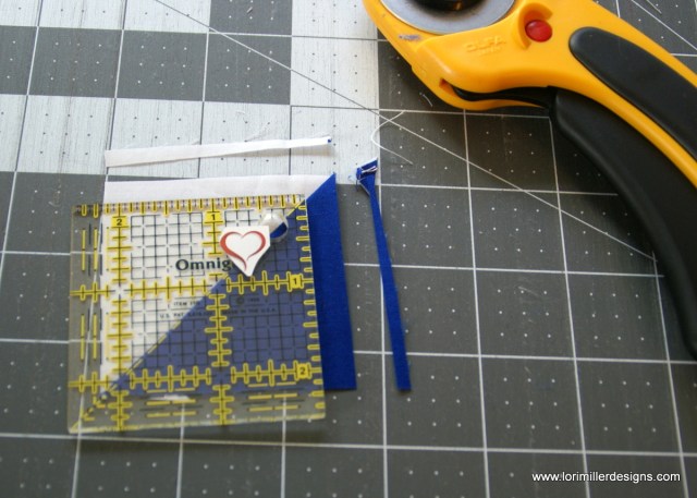 - Press the seams to the darker fabric. Trim the blocks to 2 1/2″ square.