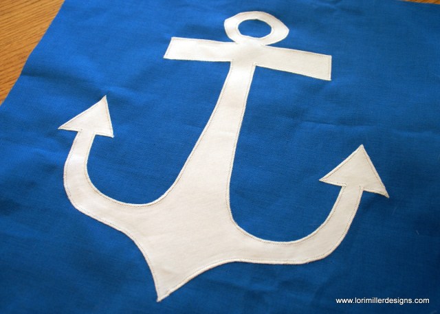 - Position the anchor in the center of the 16 1/2″ light blue square. One you have it where you like it, press the anchor onto the center of the pillow.