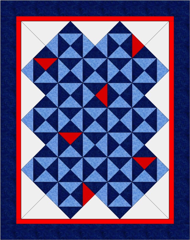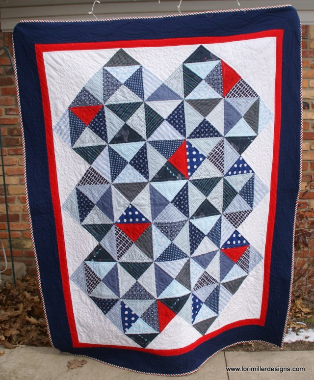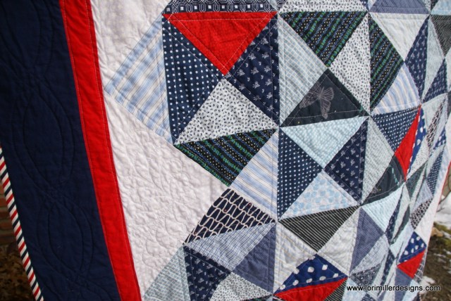 We often get fabric donated to our group from the local community. All of the fabrics in the quilt I made were donated. I had a selection of chambrays and red and blue cotton fabrics with tiny stars printed on them.
