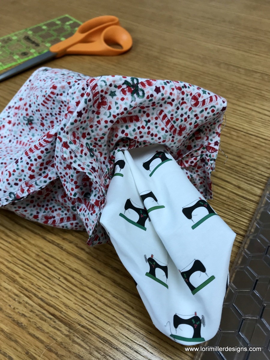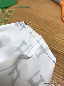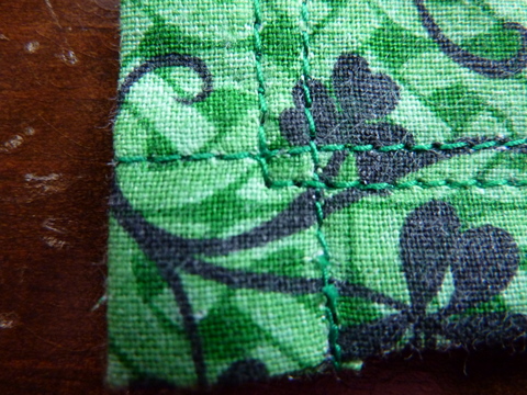 When you get to the corner, take two stitches past the intersecting stitch line and turn. If your stitch length is 2.5 mm, it should be about the right position away from you original line again. Stitch all the way around. Trim your threads.