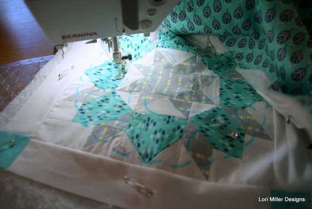 - Quilt as desired. I echoed the seam lines for the half square triangles. I added feathers for the white background space and quilted a large chain in the dark blue border.