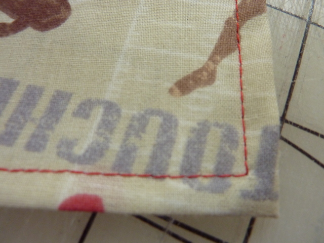 - Cut 2 side red border strips 2″ x 62 3/4″ long. Stitch to the sides of the quilt being careful not to stretch the bias edges of the white background.