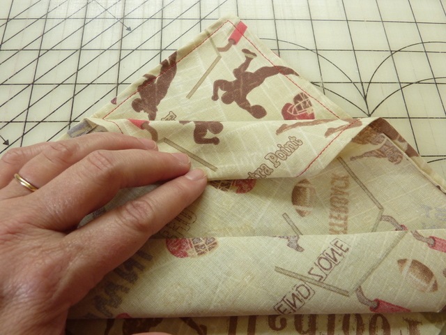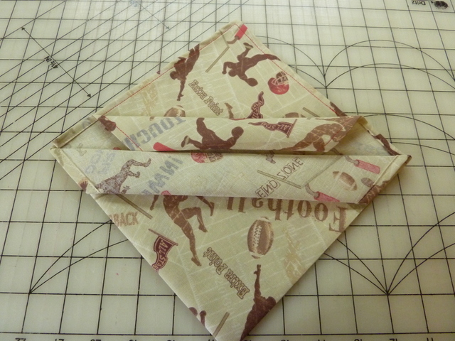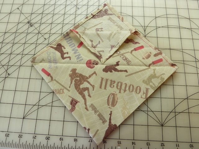 - Make 2 more sets of half square triangle units using the dark blue and red fabrics.