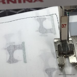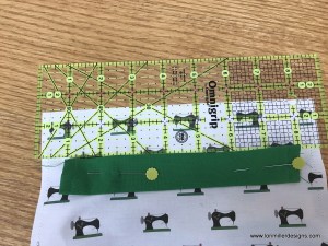 4. Measure down 1 1/2″ from top of printed fabric and pin the casing down.  Stitch very closely on the top and bottom to secure the casing.  Backstitch at the beginning and end of your seam.  Sew both casings.