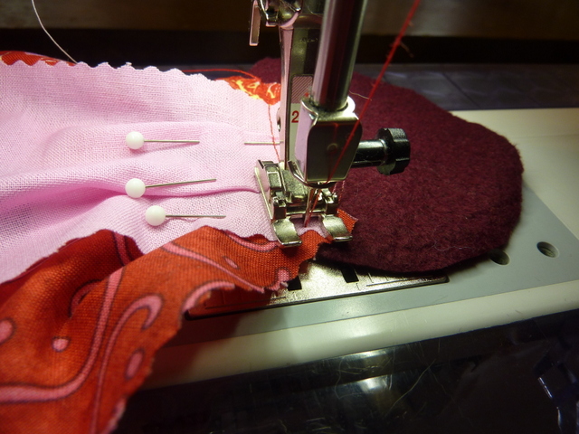 - Place your streamer ribbons over the bottom of the felt circle base. Stitch across all of the ribbon streamers and tucks, backstitching each side to hold it in place.