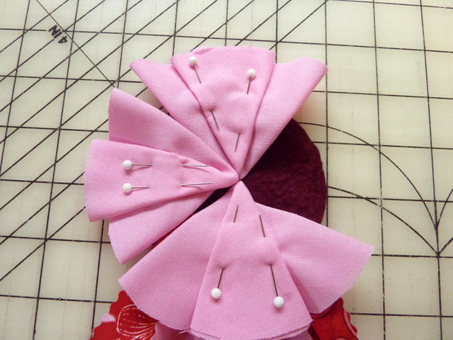 - Begin laying the small pleated circles so that they cover the stitched seam from the large folded circles underneath.