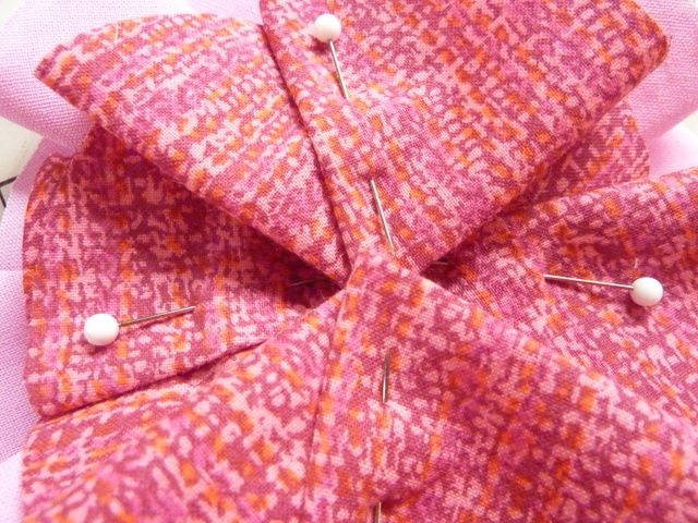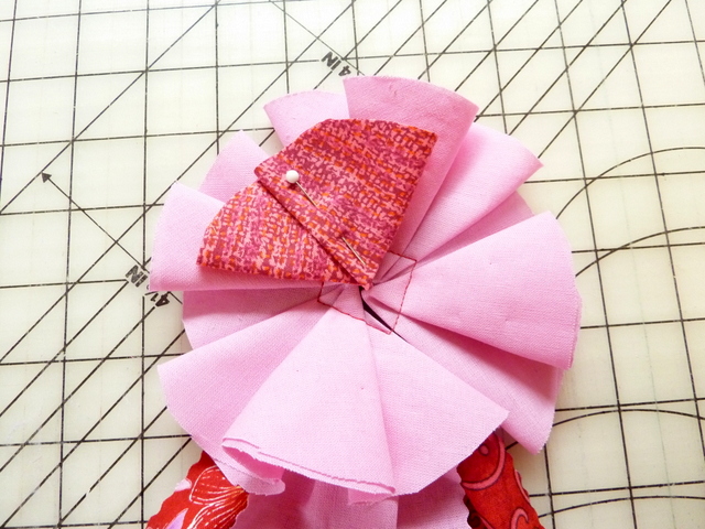 - Using a pin, pin the tuck to one side of the middle ribbon C at a slight angle.