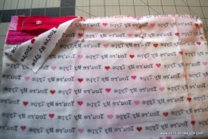 - Next, take your 22 inch ribbon and fold almost in half leaving one end about one inch longer than the other. Pin the ribbon flat on the right side of the pocket about halfway down the side of the roll. Make sure that you will catch the ribbon when you stitch the side seam. Tuck the ends out of the way so that you do not catch them in the side seams.