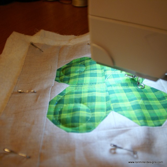- Stitch down from the markings on the pocket to make the silverware channels. You will have three stitch lines. Do a couple of back stitches at the top to secure the channels.