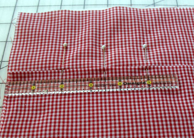 - From the left side of the pocket, measure 2 inches, 3 1/2″ and 5″ at the top and bottom of the pocket. These will mark the stitch lines to make the channels for the silverware.