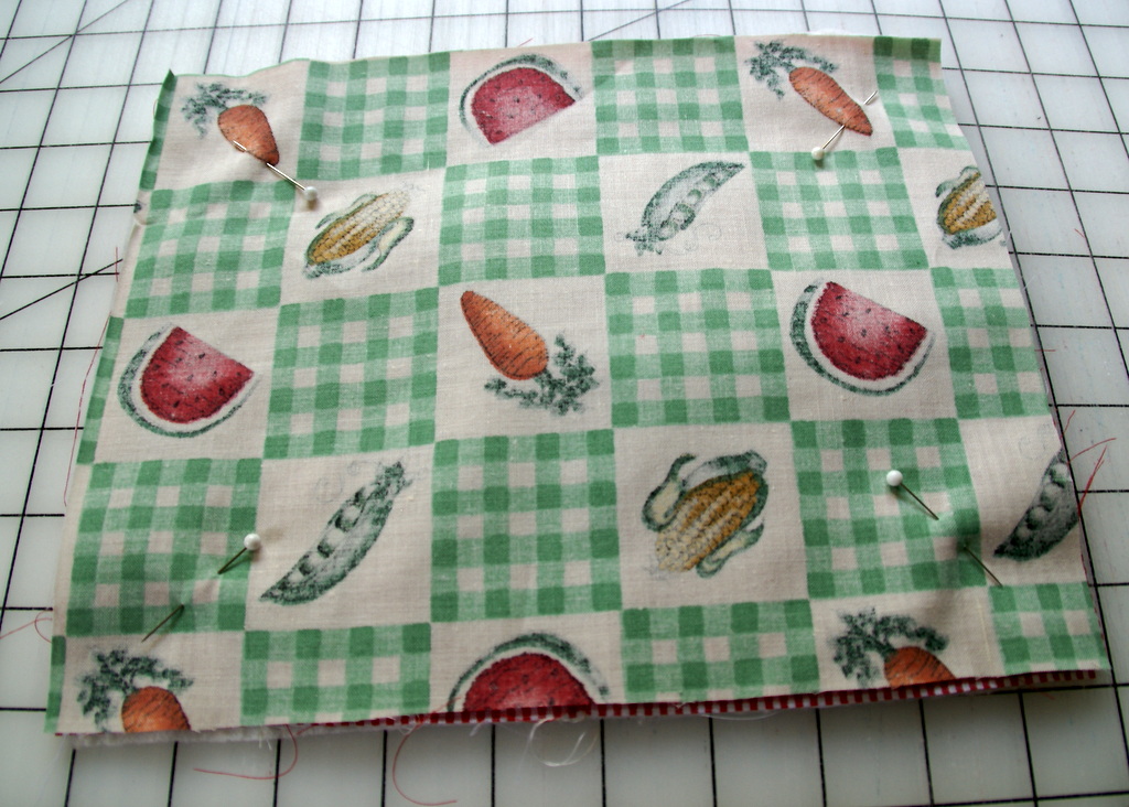- Layer the rectangle from the print fabric over the pocket, right sides together and pin in place.