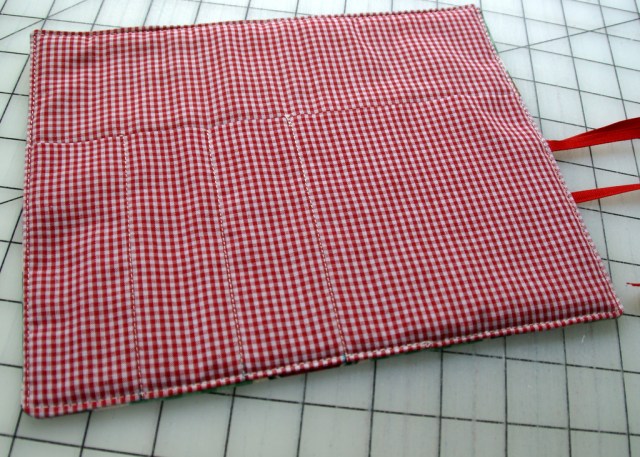 - Next, take your 22 inch ribbon and fold almost in half leaving one end about one inch longer than the other. Pin the ribbon flat on the right side of the pocket about halfway down the side of the roll. Make sure that you will catch the ribbon when you stitch the side seam. Tuck the ends out of the way so that you do not catch them in the side seams.