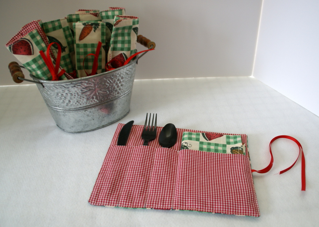 - Your first silverware roll is completed, now just make three more! These really do stitch up fast, sew them assembly line style! To store, just roll them up and tie with the ribbon.